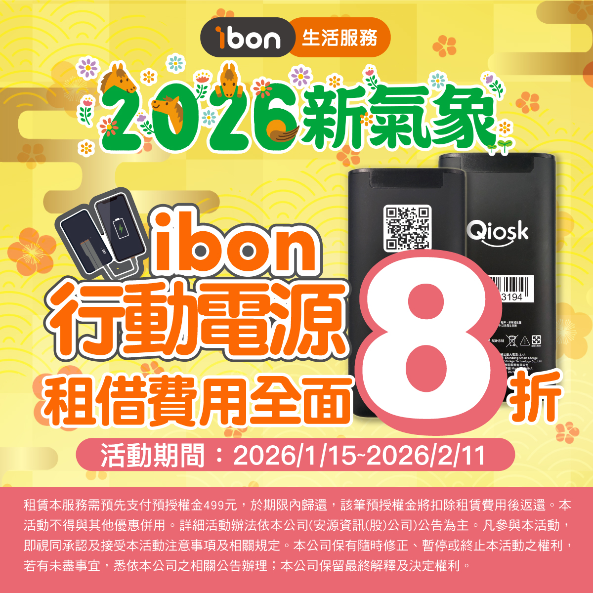 2026新年新氣象,凡於活動期間,ibon行動電源租借費用,包含手機支付、現金支付及icash支付,免輸入代碼,全面8折優惠。